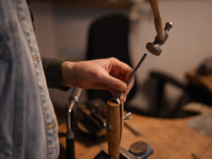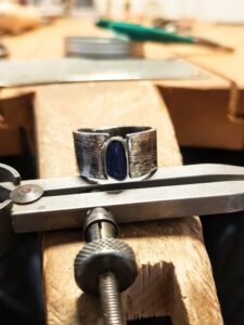 Am zweiten Kurstag wird der Ring oder Anhänger weiter ausgearbeitet und individuell gestaltet. Die besondere Herausforderung besteht darin, die Fassung harmonisch in das Schmuckstück zu integrieren, sodass Fundstück, Form und Oberfläche eine stimmige Einheit bilden. Auch hier ist kreativer Ausdruck im Rahmen der technischen Möglichkeiten ausdrücklich willkommen.